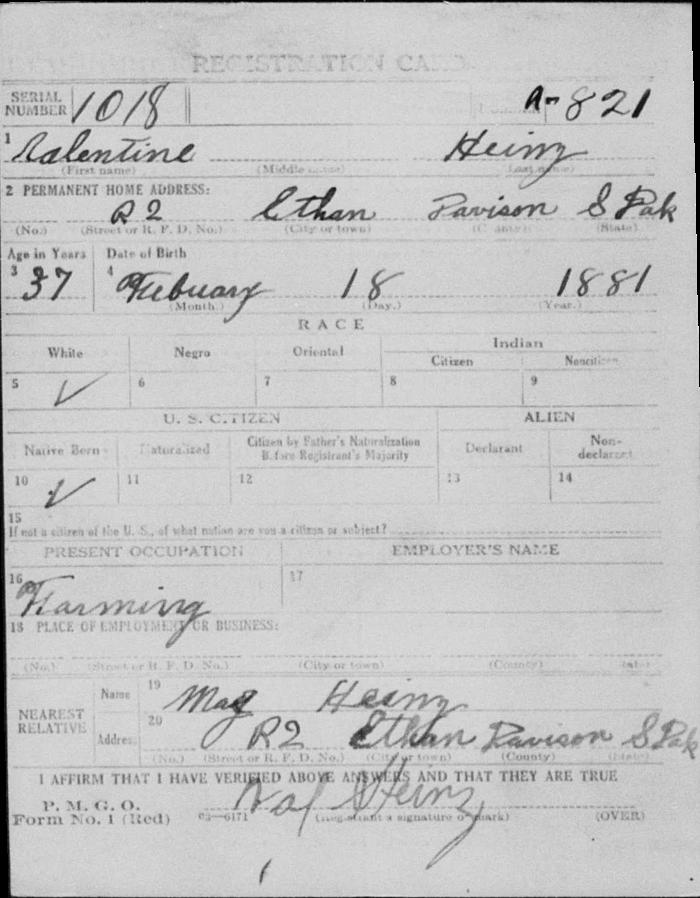 ➔ Valentine (Val) Heinz's World War I Draft Card. Circa 1918